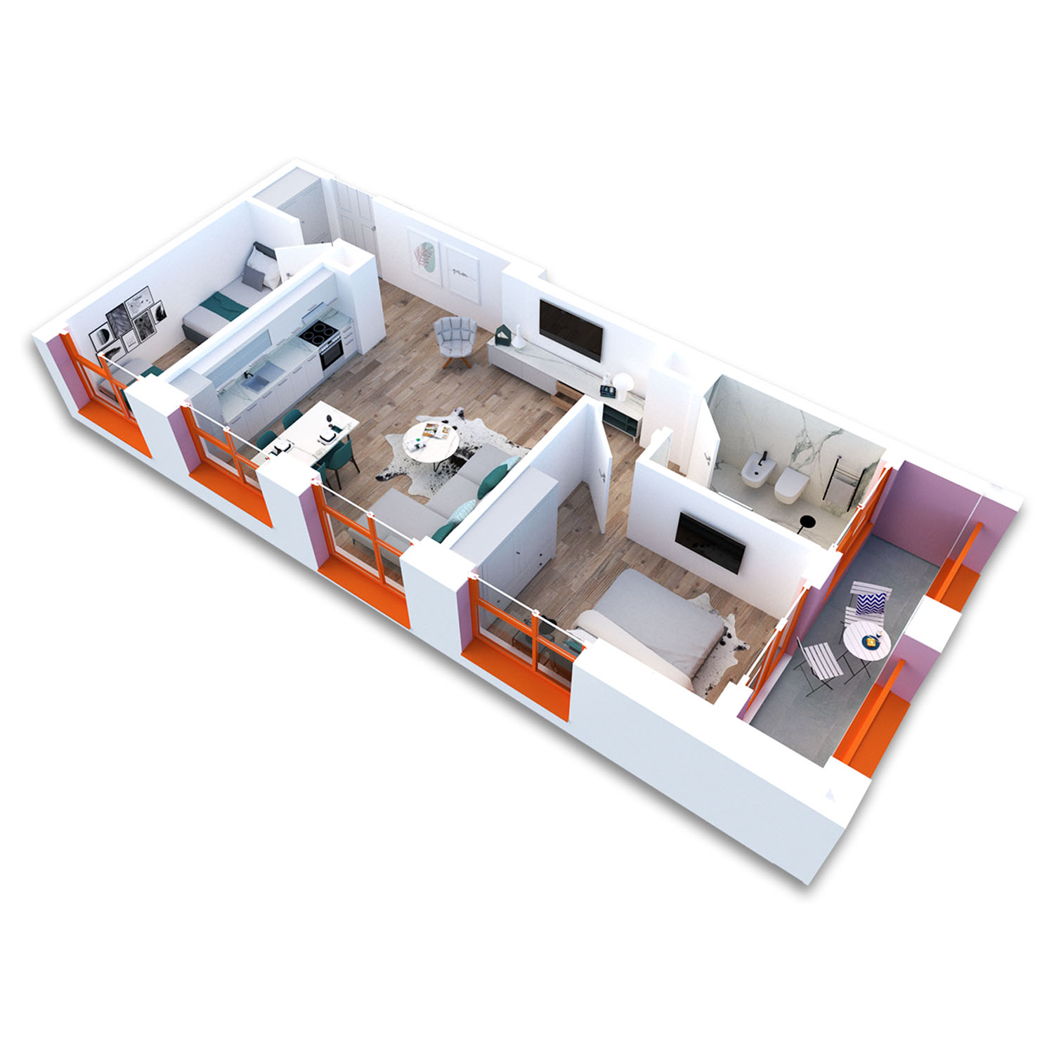 Apartamenti a siperfaqe 85.6 m2, ka orientim jug-veri-lindje dhe ndodhet ne katin e katert. Organizohet ne nje sallon bashke me kendin e kuzhines, dy dhoma gjumi, dy tualete dhe nje llozhe. Hyrja per ne apartament realizohet nepermjet nje korridori te vogel, i cili ben shperndarjen per ne ambientet perkatese, ne te djathte salloni dhe kuzhina e vecuar, salloni ndricohet ne lindje me pas nepermjet nje korridori tjeter shperndares aksesohen tualeti kryesor ne te majte, dhoma e gjumit te femijeve ne te djathte me orientim lindje dhe perballe dhoma matrimoniale e organizuar me tualet te dedikuar dhe llozhe, e cila ka orientim lindje.
